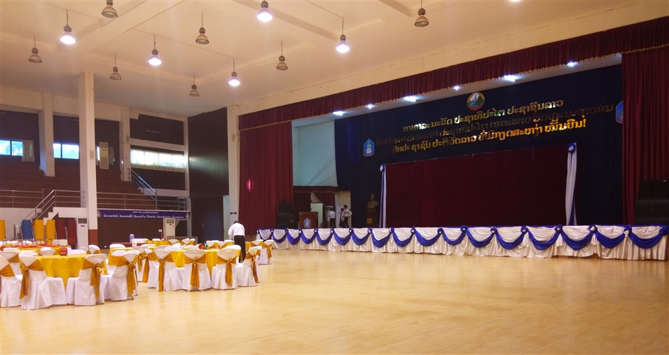 大禮堂在學(xué)校行政樓旁邊,很多人在《留學(xué)|直擊老撾國立大學(xué)入學(xué)現(xiàn)場》中看到過。大禮堂內(nèi)部裝飾得整潔明亮,正中央是舞臺(tái),四周設(shè)有看臺(tái),大廳中央也可以擺放一些桌椅,所以一般用于文藝演出和召開大型會(huì)議。