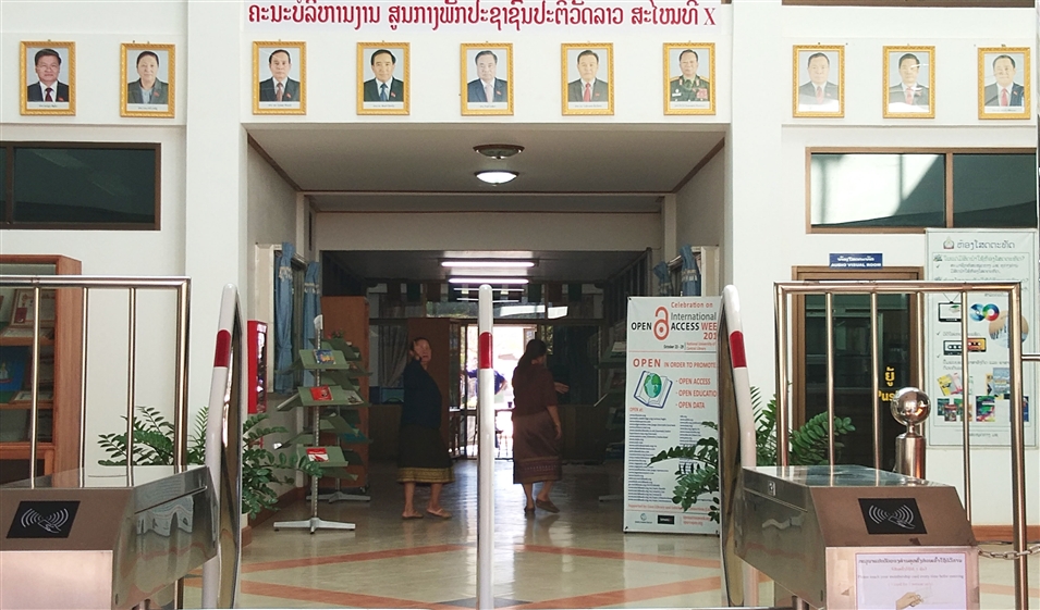 正對(duì)著圖書館入口處的墻上掛著一排相框,展示的是本屆老撾人民民主共和國(guó)中央領(lǐng)導(dǎo)的照片。