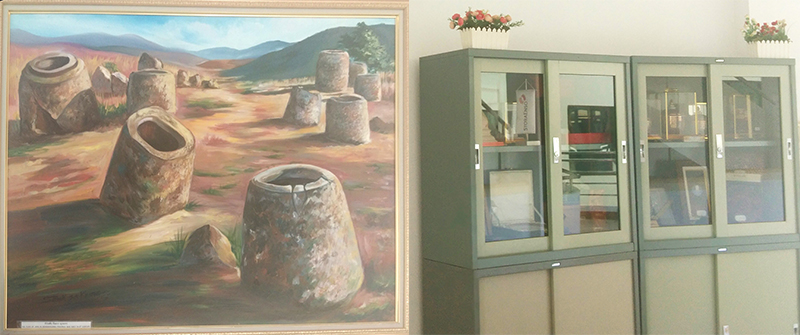 二樓樓梯拐角處掛著老撾古老寺廟油畫,旁邊的柜子里整齊擺放著幾排各國(guó)國(guó)旗;三樓樓梯拐角處掛的則是川壙省石缸平原油畫,旁邊的柜子里放置著一些老撾紀(jì)念品。