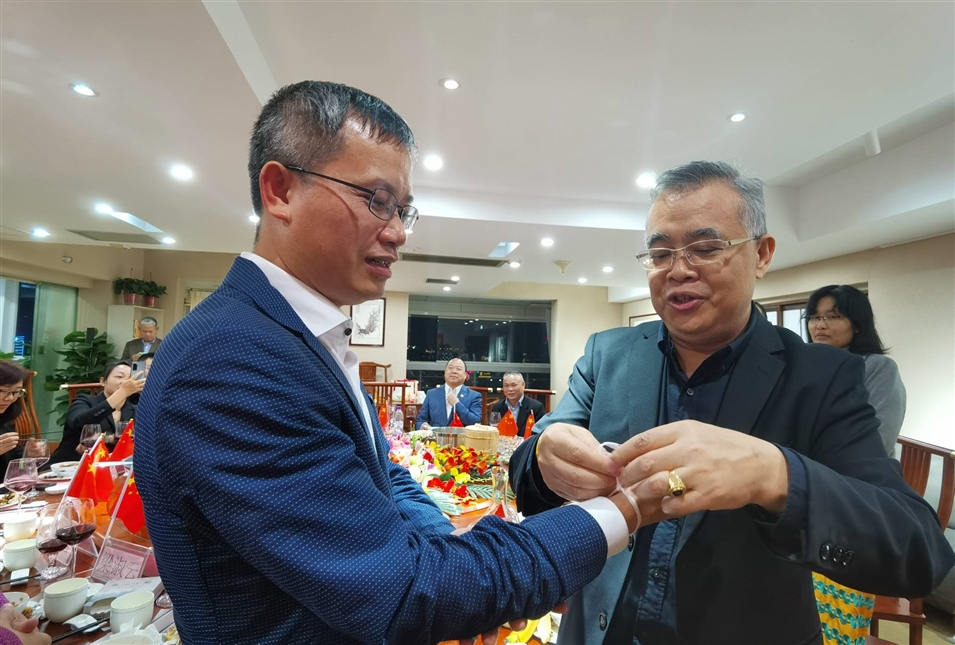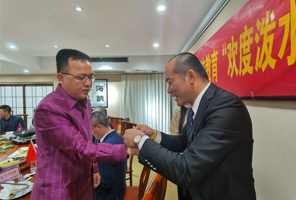 (老撾駐南寧總領(lǐng)事館總領(lǐng)事維拉薩宋蓬先生為致公黨廣西區(qū)委秘書長(zhǎng)兼辦公室主任李永政先生栓線禮節(jié))
