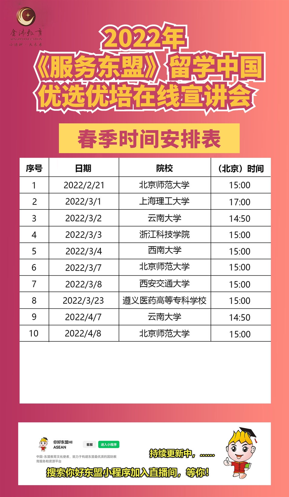 2022年2月21日起由我司聯(lián)合多所高校開(kāi)展的“2022年春季留學(xué)中國(guó)優(yōu)選優(yōu)培線(xiàn)上直播宣講會(huì)”將在“你好東盟”微信小程序上進(jìn)行開(kāi)播。