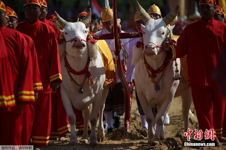 接著由婆羅門教士率領(lǐng)神牛、主犁官、女祭師進(jìn)行模擬耕種和播種。在神牛選吃稻谷、玉米、綠豆、芝麻、青草、水和酒儀式中,神牛選吃草意味著今年雨量充足,牲畜長勢良好、榖物水果豐收。