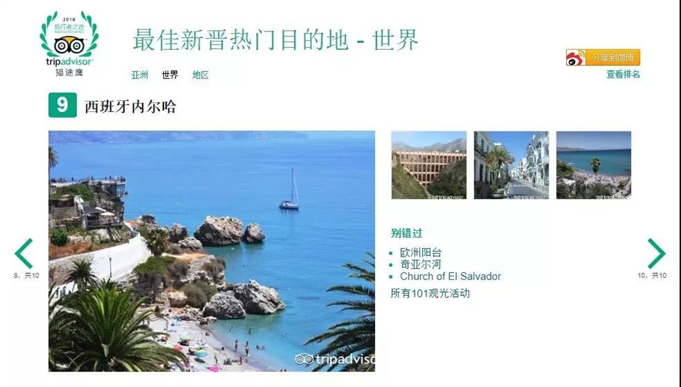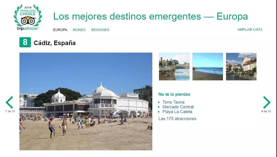 西班牙的兩座城市也分別進入了歐洲最佳熱門目的地和世界最熱門旅游目的地榜單:內爾哈,位列歐洲第四,世界第九;加的斯,位列歐洲第八。