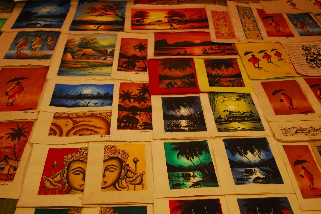 老撾原生態(tài)的手工藝造紙非常有名,也是在市場(chǎng)上最常見(jiàn)的一種工藝品,包括紙畫(huà)、紙燈罩、名信片、筆記本等種類(lèi)。這種紙質(zhì)藝術(shù)品的繪畫(huà)內(nèi)容多與佛教有關(guān),極具老撾特色。