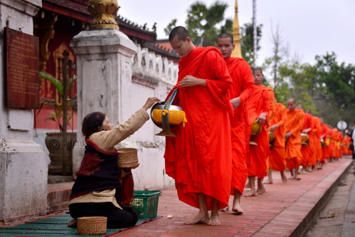 在老撾的許多地方,布施是一道獨(dú)特的佛教風(fēng)景。每天拂曉,僧人們會離開寺院,身披橙色袈裟,結(jié)隊(duì)到街道上或村莊里化齋。虔誠的佛教徒跪在道路的一邊,雙掌合十,接受僧侶誦經(jīng)祝福。誦經(jīng)完畢,僧侶們排著隊(duì)伍依次從人們的面前赤腳行過,人們把米飯、餅干、水果、雞肉等食物放進(jìn)僧人們的竹編小籃中。這些食品,就是僧人們一天的口糧。布施完了,僧人們回到寺廟進(jìn)餐。老撾僧侶恪守“過午不食”的修行規(guī)矩,從中午到夜晚,這些僧侶就不再進(jìn)食任何食品,而對于當(dāng)天不能吃完的食物,寺廟會把它們施舍給其他需要幫助的民眾,如貧困的小孩。老撾人虔誠地相信,這種施舍對于自己的未來和前途至關(guān)重要。