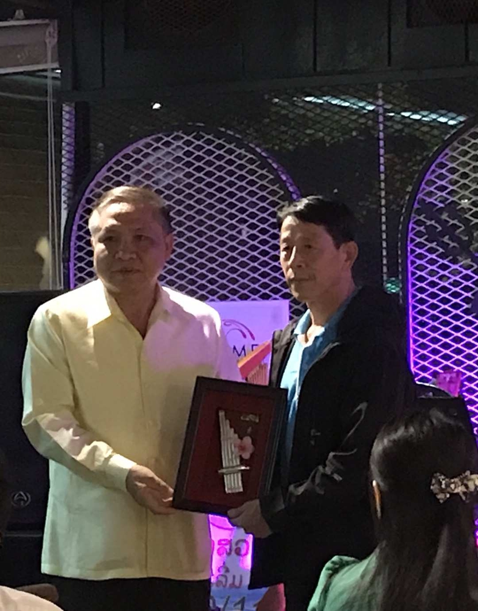 11號(hào)晚上老撾國(guó)立大學(xué)校長(zhǎng)宋西·諾潘賽為劉傳書(shū)老師、王慶陽(yáng)老師頒發(fā)紀(jì)念品,表示對(duì)兩位老師的感謝,感謝兩位老師對(duì)老撾國(guó)立大學(xué)的支持與幫助,并希望兩位老師以后能常來(lái)國(guó)立大學(xué)交流訪問(wèn)。